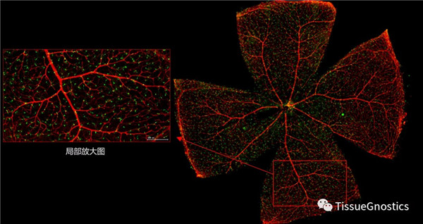 一般而言,眼底圖像通常都是通過激光掃描成像進行采集,但是由于眼底可觀測的視野往往是很有限的,一個患者的眼底信息需要多張掃描圖像才能完全顯示出來。這種局限性大大不利于病情進行全面的、細致的診斷。Tissue Cytometry全景組織流式定量分析技術進行全景圖像獲取,在單細胞、組織結構、細胞空間信息等多個層面進行定位、定性、定量分析。從而更好的對病變區域進行有針對性的跟蹤觀察和全面分析。