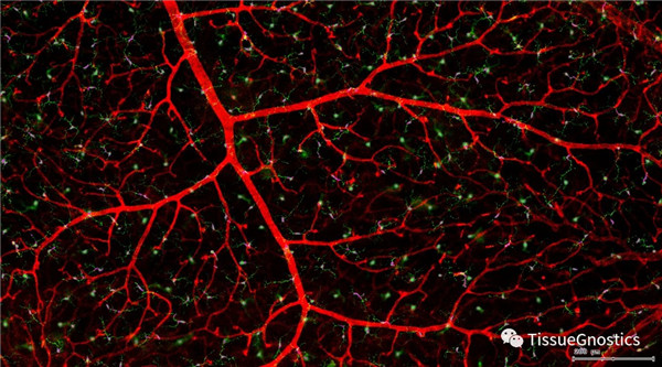 視網膜熒光樣本中小膠質細胞胞體、神經纖維識別、血管識別、血管斑點識別、神經元與血管的距離分析。