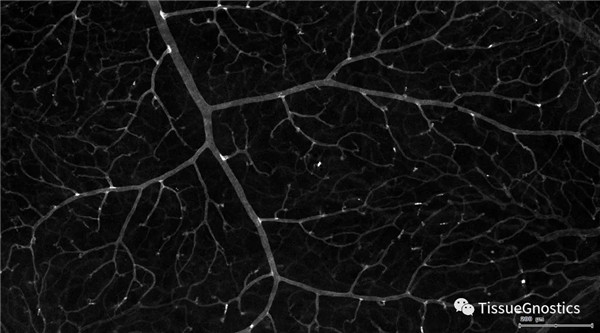 血管識別:根據Texa Red通道進行識別,并去除面積小的及非同一焦面的血管,僅對確定的清晰的同一焦面的大血管進行面積統計。