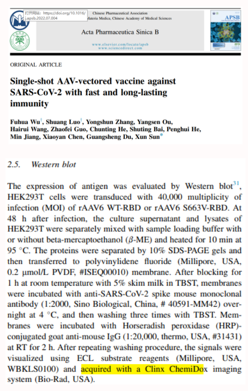 現有COVID-19疫苗的長期保護和對新變種效力的顯著降低,流行病預防和控制仍具挑戰。研究基于 CASE 制造了一種腺相關病毒血清6型疫苗(S663V-RBD),單劑量 S663V-RBD 在小鼠中誘導更持久強大的免疫應答,并引發針對三種典型 SARS-CoV-2假病毒(包括野生型 C.37(Lambda)和 B.1.617.2(Delta))的優異中和抗體,基于CASE的S663V-RBD可能會為當前和下一次流感大流行提供新的解決方案。其中,研究團隊使用勤翔(Clinx)化學發光成像系統進行蛋白信號成像。