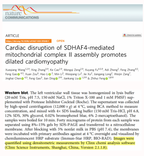 研究成果指出SDHAF4在心臟應激過程參與心肌功能調控的新機制,并表明補充SDH底物富馬酸鹽或Drp1的抑制劑(Mdivi-1)靶向干預線粒體,可以顯著改善線粒體動力學和心臟功能,并延長心肌梗死模型(MI)小鼠和DCM小鼠的壽命。其中,研究團隊使用勤翔(Clinx)化學發光成像設備進行蛋白印跡成像與分析。