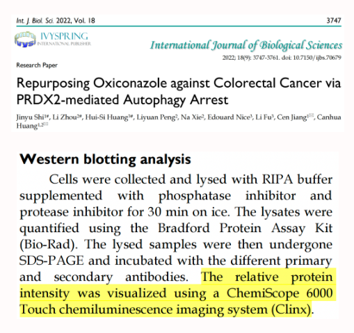四川大學黃燦華教授、成都中醫藥大學姜岑教授、澳大利亞莫納什大學Edouard Nice教授團隊等在《International Journal of Biological Sciences》發表“Repurposing Oxiconazole against Colorectal Cancer via PRDX2-mediated Autophagy Arrest”文章。其中,研究團隊使用了勤翔(Clinx)化學發光成像系統進行了蛋白印跡成像。