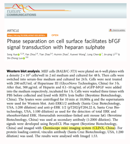 該文首次揭示了堿性成纖維生長因子(bFGF)可以在細胞膜表面硫酸乙酰肝素的作用下發生細胞外液液相分離(LLPS),進而實現下游信號通路的激活,這一新的發現為細胞外膜上蛋白質相分離的相關研究提供了新的理論及實驗依據。其中,研究團隊使用勤翔(Clinx)化學發光成像設備進行蛋白印跡成像分析。