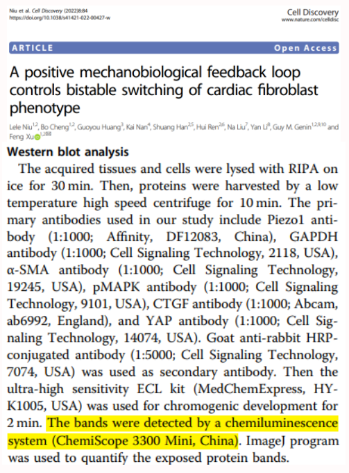 研究利用集成的體外和計算機模擬,發現整合素β1和Piezo1活化之間存在一個相互增強的機械正反饋回路,以形成一個雙穩態開關。雙穩態開關由基質彈性模量的擾動啟動,該擾動被放大以觸發涉及Ca2+和YAP的下游信號傳導,從而遞歸地導致成纖維細胞進一步硬化其環境。通過同時干擾新發現的機械正反饋回路和調節基質彈性模量,研究人員逆轉了CF表型轉變的標志物,為纖維化疾病提供了新的治療靶點。其中,研究團隊使用勤翔(Clinx)化學發光成像系統來量化曝光的蛋白質條帶。