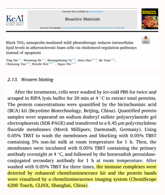 中國科學院寧波材料所吳愛國團隊在《Bioactive Materials》雜志發表題為“Black TiO2 nanoprobe-mediated mild phototherapy reduces intracellular lipid levels in atherosclerotic foam cells via cholesterol regulation pathways instead of apoptosis”文章。其中,研究團隊使用勤翔(Clinx)化學發光成像設備ChemiScope 6200Touch進行蛋白印跡成像與觀察。