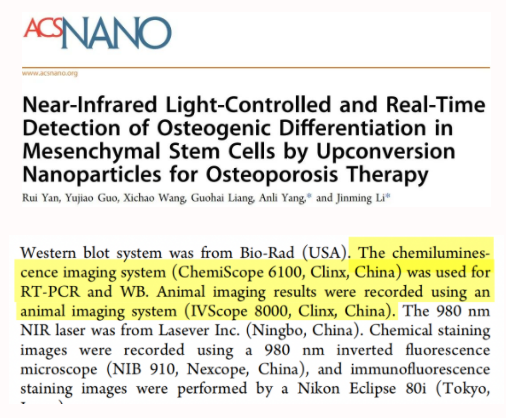其中,研究團隊使用勤翔(Clinx)化學發光成像設備ChemiScope 6100進行核酸檢測和蛋白印跡分析,使用勤翔(Clinx)小動物活體成像設備IVScope 8000記錄成像結果。