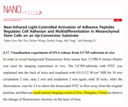 其中,研究團隊使用勤翔(Clinx)小動物活體成像設備IVScope 8000進行活體實驗,觀察小鼠背部熒光強度的變化。